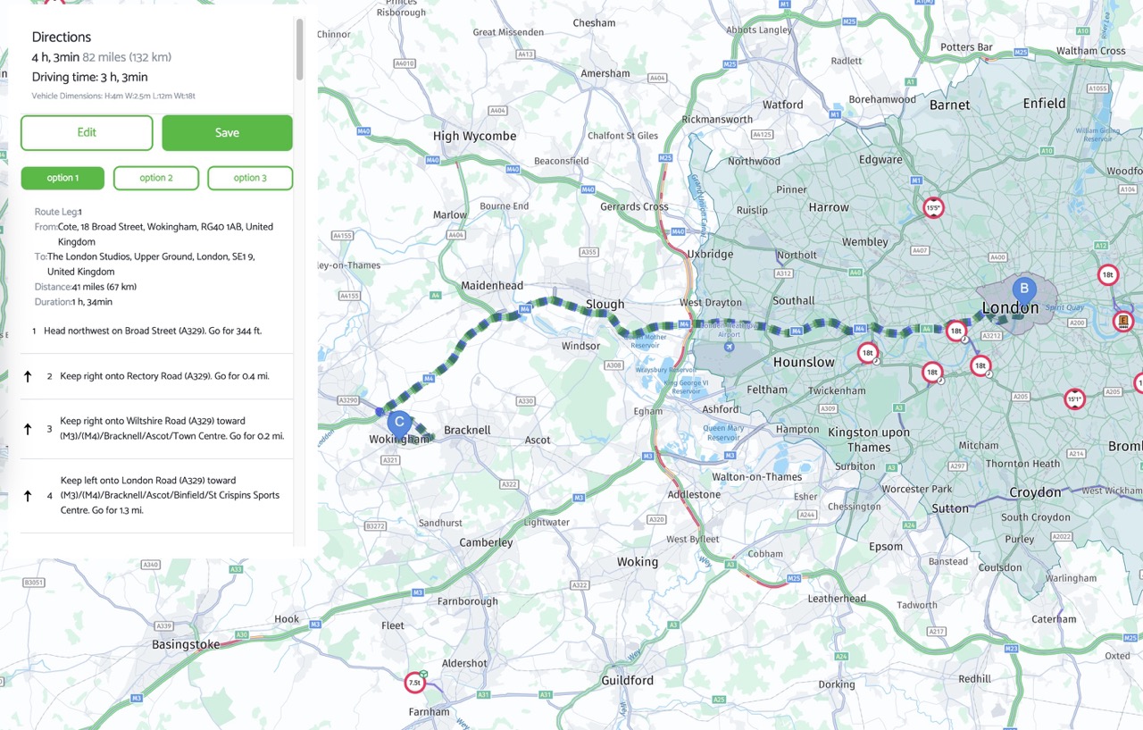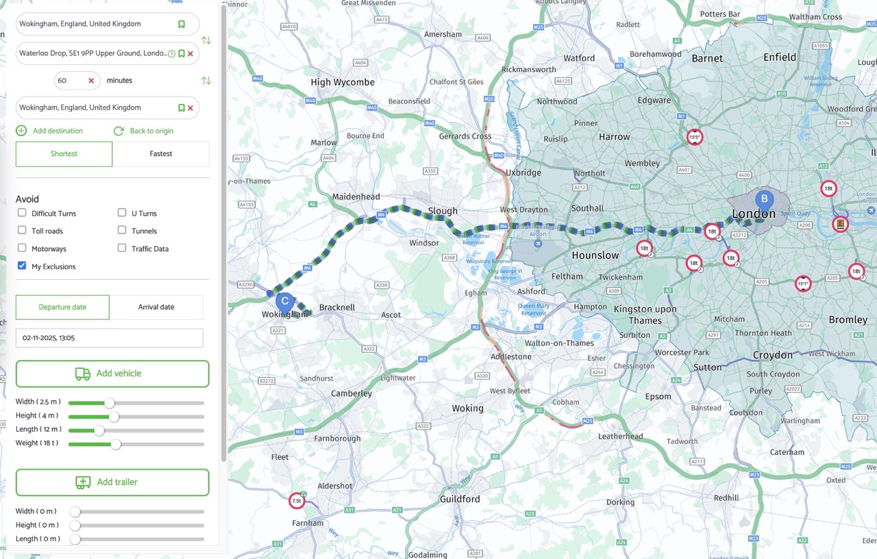We take into account your vehicle dimensions, route destinations, date and time of journey, road requirements (e.g. weight limits), bridge heights, temporary road closures (eg. roadworks, major events), low emission zones and local authority requirements such as London Lorry Control Scheme.